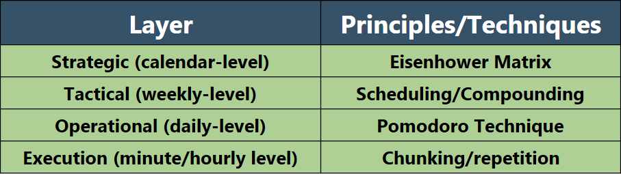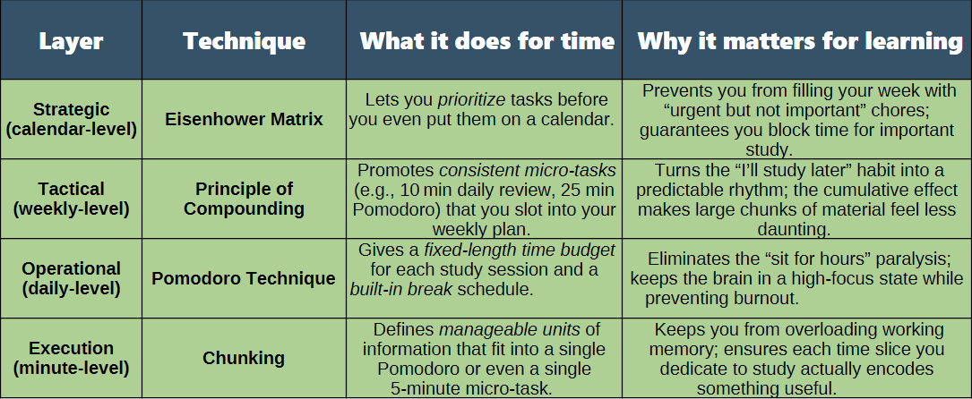I'm going to share with you how I took four principles from time management and learning domains and organized them into a layered learning system. This post is going to cover the Eisenhower Matrix, the principle of compounding, the Pomodoro Technique, and chunking combined with repetition. I show how to put all of that together into an effective learning system.